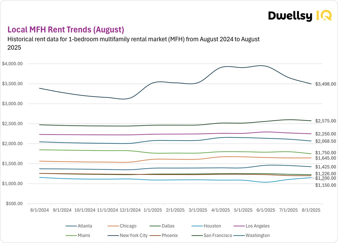 According to the August 2025 MFH data, the strongest year-over-year rent growth came from Chicago (+5.2% YoY), San Francisco (+4.1% YoY), Atlanta (+3.8% YoY), and New York (+3.3% YoY). Washington also posted steady gains (+1.0% YoY), reinforcing its role as a stable metro in the multifamily housing market.
