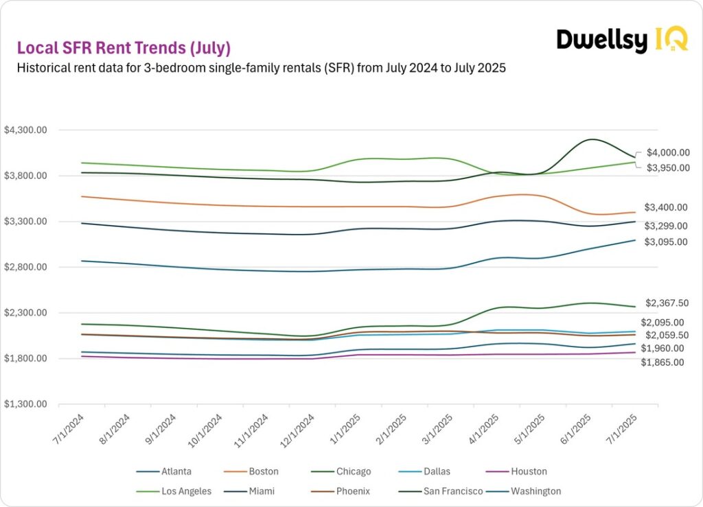 Washington, D.C. strengthened further in July, climbing to $3,095. This represented a 3.2% MoM increase and a 7.9% YoY gain, positioning it as one of the strongest performers in the dataset. Miami ended the month at $3,299, up 1.5% MoM but only 0.5% above last year, suggesting slower growth in South Florida compared to the capital.